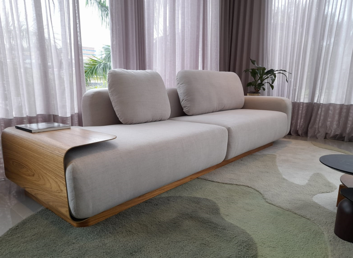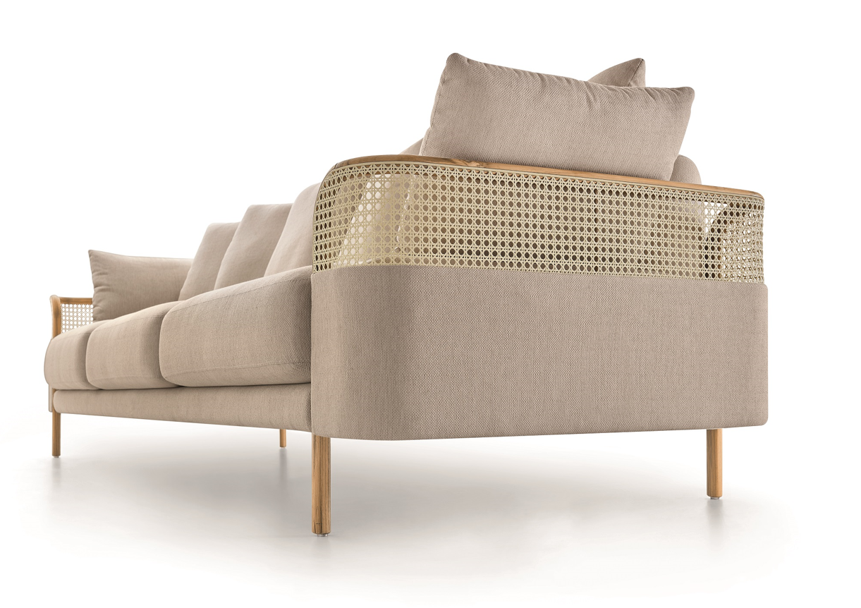 De 2022, o sofá Vuoto da Karams Estofados é assinado pelo Estúdio Metta, que criou um modelo versátil, pensado para transitar entre o estar e a TV com inúmeras possibilidades de modulação. Seu desenho minimalista é composto por linhas simples, que conferem robustez e ao mesmo tempo leveza pela sensação de estar flutuando, tanto no assento quanto nos braços. Destaques para a base recuada e o suporte contínuo dos assentos em madeira, que se encerra em um detalhe inusitado na face posterior do móvel de forma elegante. A possibilidade de assimetria entre os braços imprime personalidade e originalidade ao conjunto. É direcionado a um público que procura o equilíbrio entre conforto e beleza.
