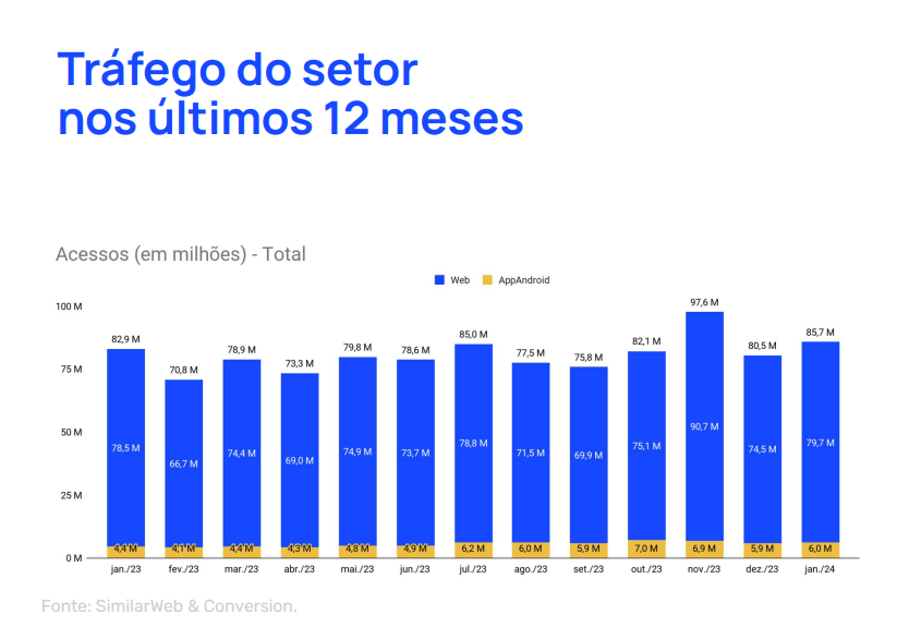 Já em relação a janeiro de 2023, porém, houve queda de 4%. À época, 2,78 bilhões de visitantes navegaram pelo comércio eletrônico do país. Nos últimos doze meses, o melhor desempenho permanece em novembro passado, quando o tráfego chegou a 2,81 bilhões.