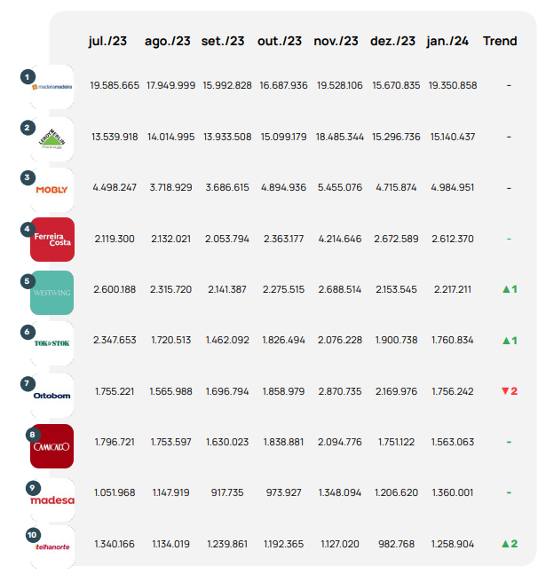 O setor de Casa & Móveis apresentou uma boa recuperação nesse primeiro mês do ano de 2024 em relação a dezembro do ano passado. O maior crescimento entre as marcas desse setor foi da Telha Norte, com 28,1%, subindo duas posições no ranking e entrando para as top 10.
