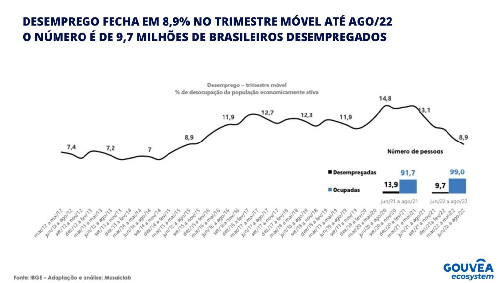 Como pode ser observado no quadro abaixo, depois de termos atingido o pico do nível de desemprego no 3º trimestre de 2021, vivemos um processo de recuperação. O nível atual, de 8,9%, é significativamente melhor em relação ao mesmo período do ano anterior e com tendência de continuidade de redução nos próximos trimestres.
