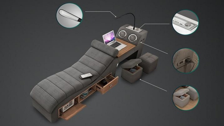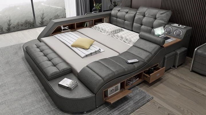 Esta cama foi concebida para compilar tudo aquilo que precisa para relaxar, sem precisar se levantar. A estrutura inclui uma cadeira de massagem reclinável controlada através de um comando, um alto-falante Bluetooth, uma estante, um cantinho de leitura, sistema de limpeza de ar e um banco de pés integrado que se abre para um espaço de armazenamento extra.