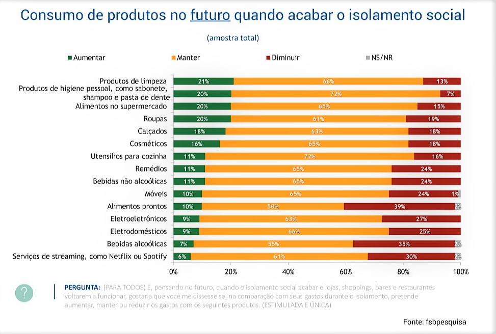 A pesquisa revelou ainda que, de um grupo de 11 bens de consumo, apenas dois terão maior procura durante os 90 dias após o fim da pandemia: roupas (34%) e calçados (31%). Menos de 10% das pessoas afirmam que pretendem comprar eletrodomésticos, eletroeletrônicos e móveis no prazo de 90 dias pós-isolamento.