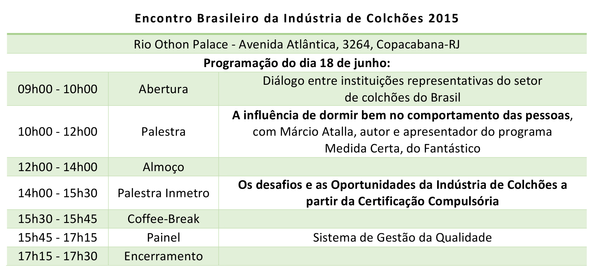 Um dos pontos altos do evento será a palestra de Marcio Atalla sobre “A influência de dormir bem no comportamento das pessoas”, prevista para as 10 horas. Os desafios e oportunidades da indústria de colchões a partir da certificação compulsória serão temas da palestra da técnica Cristiane Sampaio, da Divisão do Programa de Avaliação da Conformidade da Diretoria da Qualidade, do Inmetro, a partir das 14 horas.