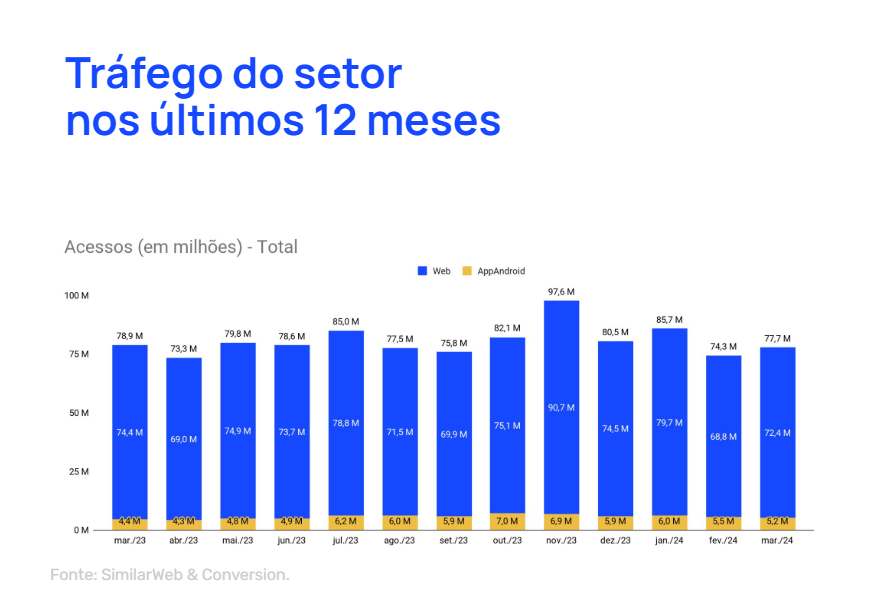 O e-commerce brasileiro teve crescimento no número de acessos no mês de março. Depois da queda registrada em fevereiro, o terceiro mês do ano registrou alta de 5,6%, graças ao Dia do Consumidor, com um total de 2,470 bilhões de acessos únicos, de acordo com os dados apresentados no último Relatório Setores E-commerce no Brasil, da Conversion.