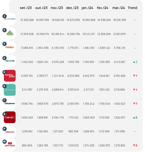 No mês de março foi registrado crescimento nesse setor de 4,5% em relação ao mês anterior no número de acessos. O maior crescimento entre as principais marcas foi o da Tok&Stok, com 23,9%, subindo três posições no ranking e alcançando a quarta colocação.