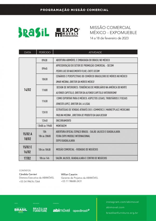 Já a abertura oficial do Espaço Brasil localizado nos salões Jalisco e Guadalajara, dentro do parque de exposições da Expo Mueble, ocorre na quarta-feira (15) às 10h, junto ao início da feira que vai até o dia 18 de fevereiro. As rodadas de negócios da Missão Comercial México também ocorrem no espaço e no Centro de Negócios.