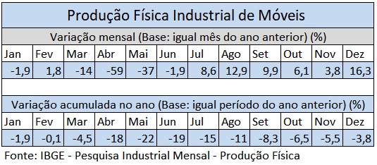 Mas, na pesquisa do IBGE, chama atenção o fato de que, apesar da escassez de matérias-primas, os 73% de alta entre julho e dezembro e os 16,3% de variação positiva em dezembro na comparação com igual mês de 2019, mostra que as indústrias trabalharam com capacidade plena no último mês do ano. Principalmente quando se lembra que em dezembro de 2019 a produção de móveis no Brasil já havia registrado alta de 16,3% na comparação com igual mês de 2018. Então, o nível de produção de dezembro de 2020 não é pouca coisa.
