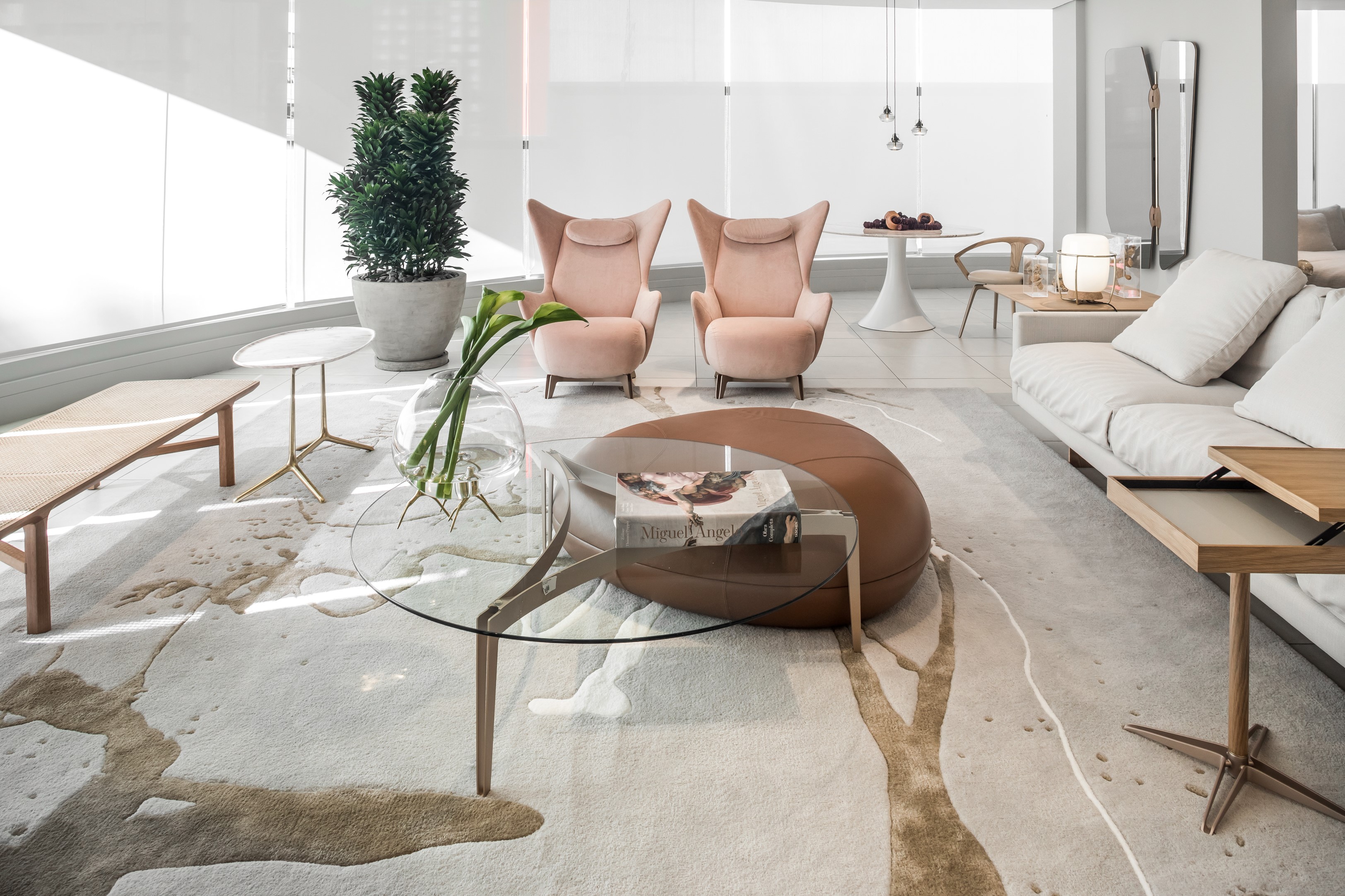 Para quem prefere mais sutileza, pequenas pinceladas de rosa são suficientes para abrilhantar o espaço. Neste projeto assinado por Luciana Baggio, a designer seleciona peças da Simmetria Ambienti - uma releitura das clássicas wing chairs - para ser o ponto alto da ambientação. As poltronas Wing, de Jader Almeida, apresentam o rosa em sua forma mais sofisticada. A paleta de cores neutras do ambiente incorpora o tom Barbiecore de maneira suave, sem deixar de enaltecer a personalidade da nuance.