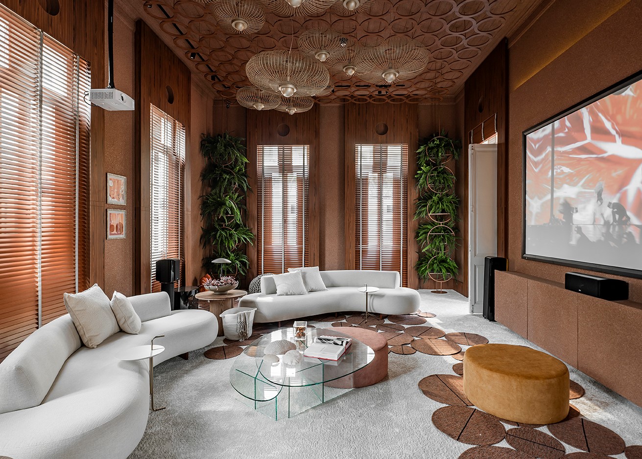 Outra opção é apostar no rosé, uma variação de rosa mais escuro que também orna com os tons neutros. Nesta proposta, a arquiteta Anna Maya explora o rosé em pontos de cor pelo ambiente, que são combinados em uma paleta que vai dos neutros aos terrosos. Essa composição de tom sobre tom resulta em uma arquitetura imponente: ao mesmo em que é despojada, também é impactante. Para fortalecer a proposta, a profissional utiliza o revestimento Pau-Ferro da Sudati, presente nos painéis dispostos por todo o home theater.