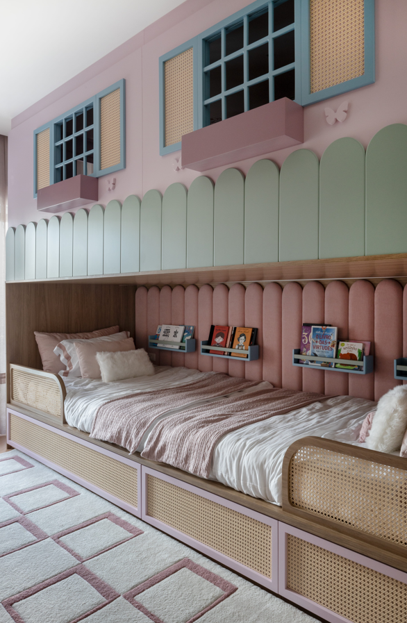Os ambientes destinados às crianças são perfeitos para investir na tendência Barbiecore. Este quarto pertence a duas irmãs, de 3 e 5 anos, que dividem o dormitório porque gostam muito de brincar juntas. As pequenas são apaixonadas por bonecas e casinhas. Considerando isso, a arquiteta Samara Barbosa projeta camas lúdicas que remetem à uma casinha de bonecas. Diferentes tons de rosa são combinados as demais cores da paleta candy colors, garantindo alegria e aconchego para o dia a dia da duplinha.