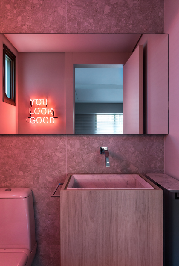 Repleto de personalidade, este consultório ousa e oferece uma experiência singular para seus pacientes. Ao entrarem no lavabo, esperando a neutralidade comum às clínicas, se deparam com uma atmosfera Barbiecore. A iluminação cénica dá um tom especial ao projeto, assinado pelo escritório BST Arquitetura. Os profissionais escolhem os móveis sob medida da Gava Ambientes Completos para aproveitar cada espaço disponível. Para completar o charme da marcenaria, a cuba revestida em madeira é combinada com o letreiro neon colocado na parede.