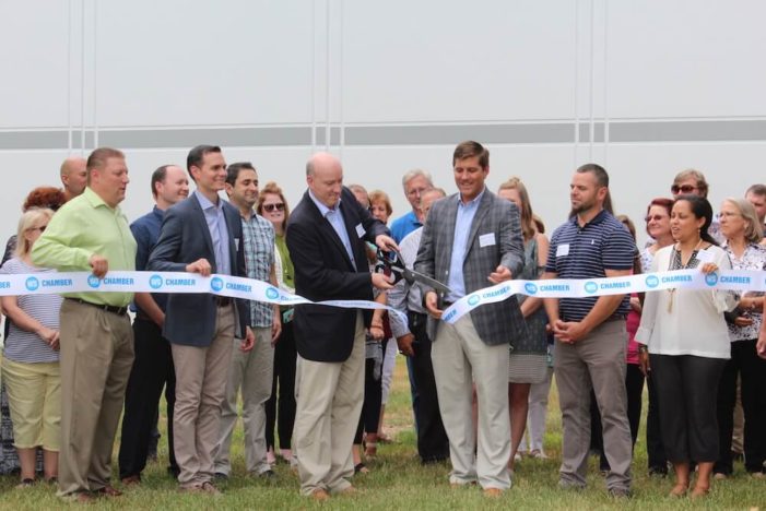 Brandon Wells, gerente geral da BekaertDeslee nos EUA, corta a fita em um novo depósito na sede da empresa em Winston-Salem, Carolina do Norte. A seu lado, Mark Owens, presidente e diretor executivo da Câmara de Comércio de Winston-Salem, além de outros convidados e funcionários |