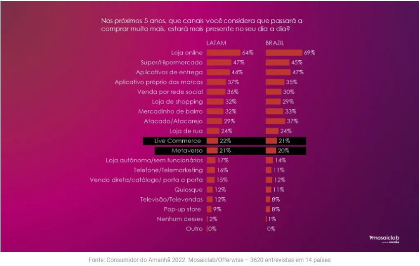 E tem muita coisa nova emergindo que deve tornar a experiência cada vez mais integrada e imersiva. O live commerce e o metaverso ainda têm pouco eco junto aos consumidores, mas tudo indica que com o incremento do 5G e o grande investimento das grandes corporações de tecnologia e startups voltadas a estes temas vamos presenciar uma transformação que promete ser tão grande quanto foi o surgimento do e-commerce. A promessa é reproduzir a experiência da nova loja física.