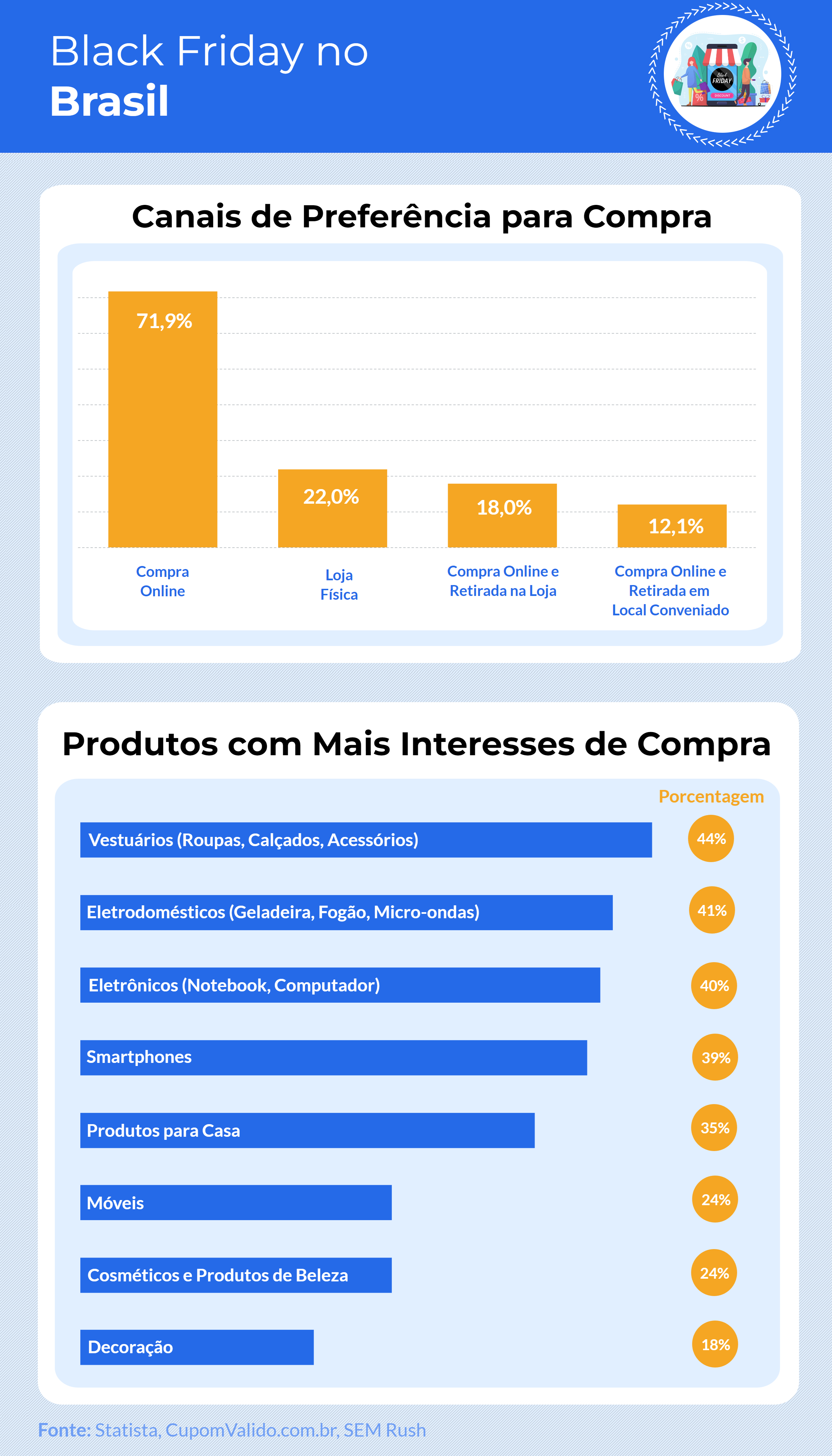 Segundo a pesquisa, 71,9% dos brasileiros preferem realizar as compras online na Black Friday. Em contrapartida, 22% preferem realizar as compras nas lojas físicas.