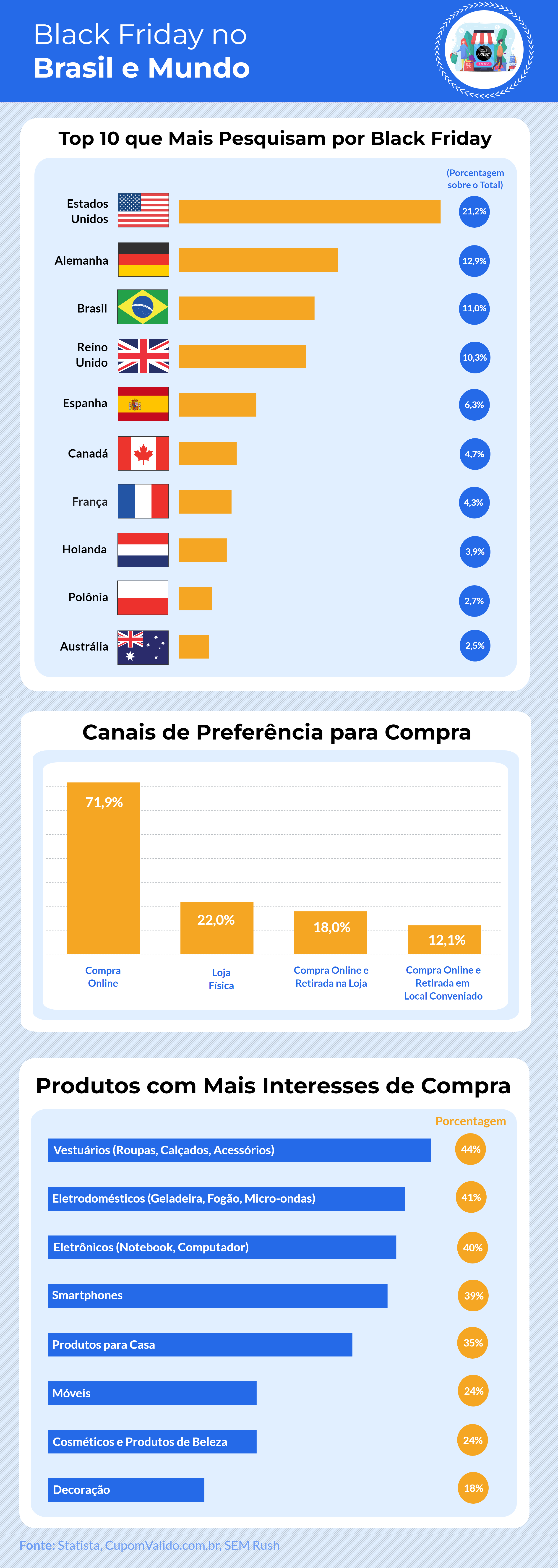 É o que revela um estudo divulgado pela plataforma de cupom de desconto CupomValido.com.br com dados da Statista e SEM Rush sobre a Black Friday no Brasil e no mundo.