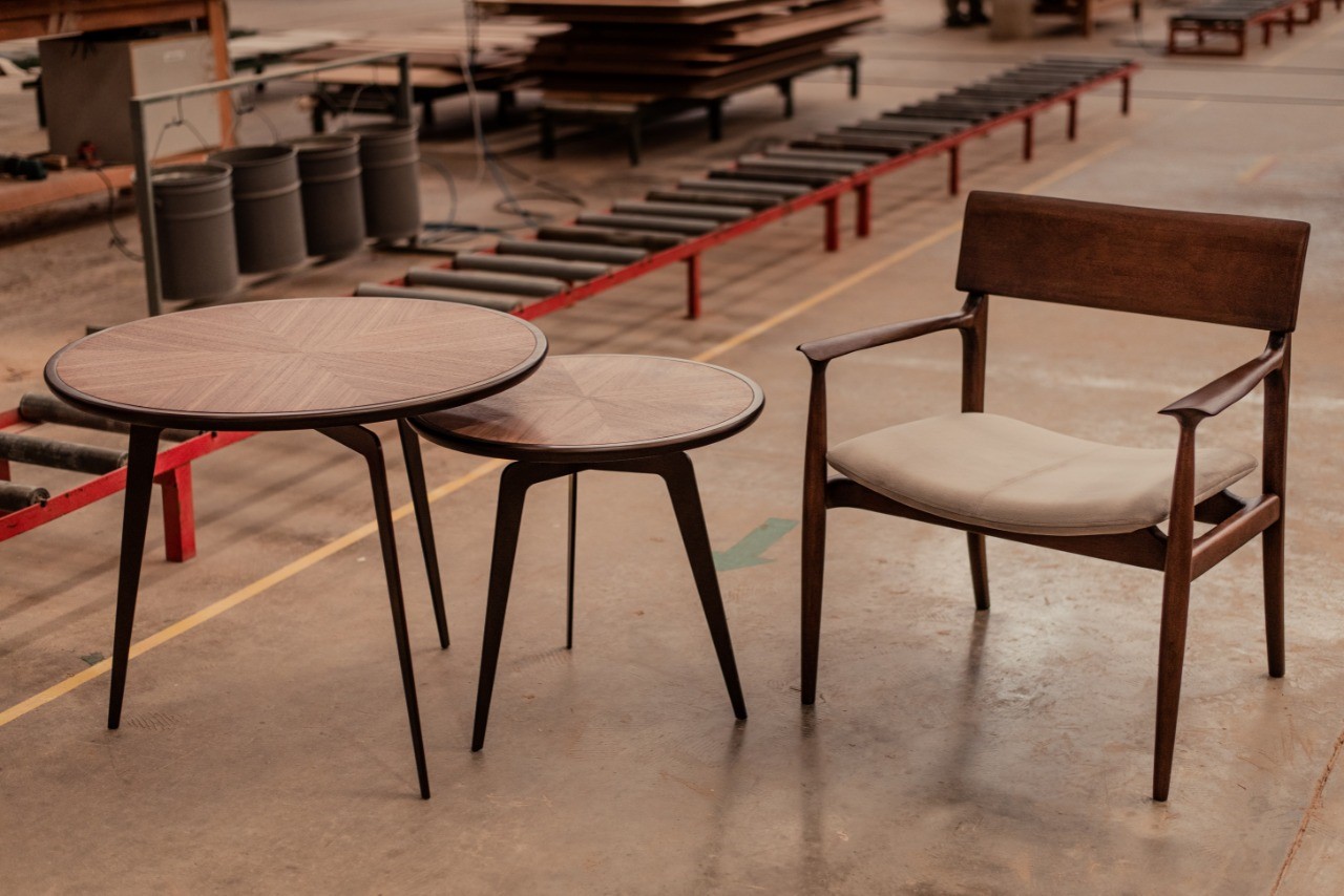 Desenho autoral e simplicidade formal é o que norteia a criação do mobiliário do estudiobola. Peças selecionadas são produzidas em parceria com a fábrica de Móveis Rizzon, produtora de mobiliário em madeira há mais de 30 anos.