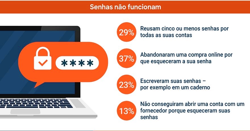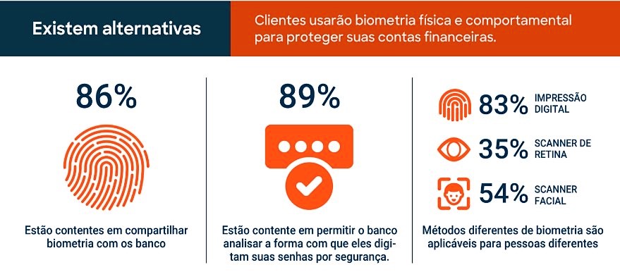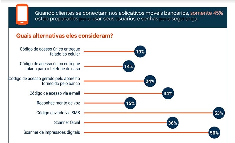Segundo a pesquisa, 53% preferem entrar em suas contas com senhas geradas por SMS a cada acesso, 50% consideram a leitura de impressão digital como boa alternativa, 36% optam por leitura facial e 34% preferem que novas senhas aleatórias sejam sempre enviadas por e-mail.
