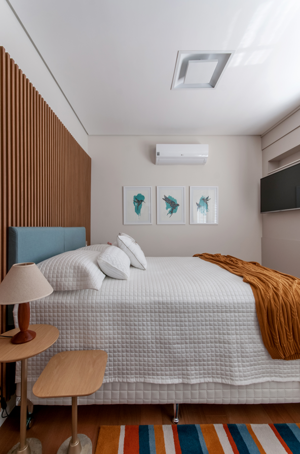Quem gosta de arriscar na combinação de cores e texturas vai se apaixonar por essa proposta da dupla Vanessa e Claudia: o mix entre a madeira ripada, com tonalidade mais escura, e que completa quase a altura da parede com uma delicada cabeceira azul, na largura da cama. Com uma fina espessura de 4 cm, esse match deixou o dormitório ainda mais aconchegante.