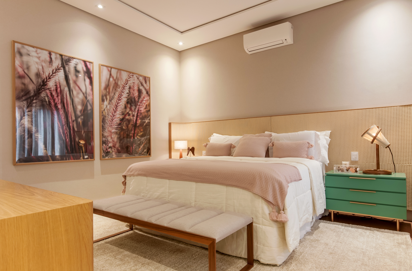 Com ar gracioso e levemente vintage predomina em mais esse dormitório de casal realizado por Vanessa e Claudia. Com as tonalidades de rosa presentes no enxoval de cama e na cortina, a cabeceira almofadada foi envolvida pela palhinha e a madeira que emolduram a parede que recoberta pelo linho. Esse arranjo reflete a essência tão particular do projeto, que valoriza o trabalho artesanal e décor afetivo do casal.