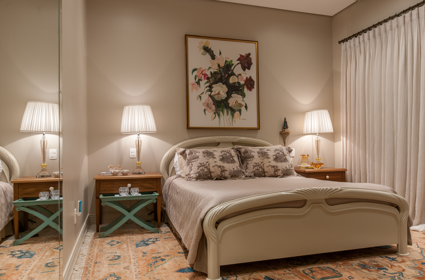 Com uma cama em formato ‘tradicional, a estrutura, incluindo a cabeceira, reflete os detalhes da madeira entalhada e laqueada, tornando-a um grande destaque na decoração que expressa elegância e sofisticação no dormitório do casal.