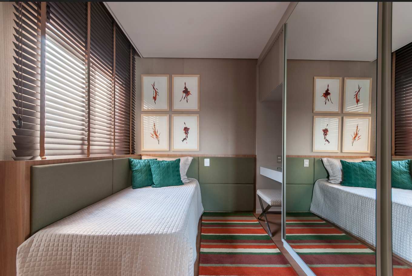 Na proposta multifuncional do ambiente, que no dia a dia funciona como dormitório e closet, a cama de solteiro foi envolvida pela proteção de uma estrutura de madeira em ‘L’ e o acabamento estofado na cor verde musgo. O mix denota uma atmosfera afetiva aos hóspedes recepcionados pelos moradores.