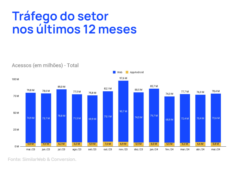 O Dia das Mães, em maio, teve forte impacto sobre o tráfego do e-commerce brasileiro. O volume de visitas às plataformas subiu 5,2% em comparação a abril, mês sem datas comemorativas, atingindo o segundo melhor resultado de 2024, com 2,52 bilhões de acessos únicos. Ficou atrás de janeiro, que contou com 2,67 bilhões, de acordo com os dados divulgados no último Relatório Setores E-commerce Brasil, da Conversion.