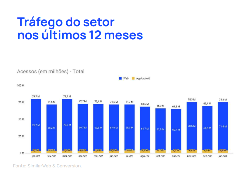 Na análise geral, de novembro a janeiro, a redução no tráfego do e-commerce brasileiro soma 5,6%. Porém essa é uma tendência já esperada para o início do ano, já que sempre há uma queda no consumo após as festas de final de ano. Os dados são do Relatório Setores do E-commerce da Conversion.