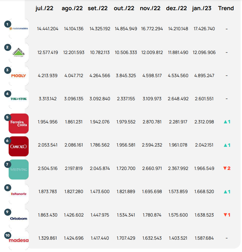 Leroy Merlin, Mobly e Tok&Stok são as outras três empresas que se mantiveram em 2º, 3º e 4º lugar no ranking, respectivamente.