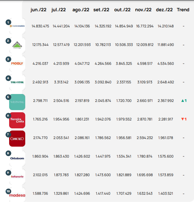 O Relatório Setores E-commerce no Brasil sempre analisa 127 sites de vendas de itens para casa e móveis, sendo que 18 deles também possuem aplicativos, que também são avaliados mês a mês. De acordo com os dados registrados em dezembro, o setor teve uma queda de 8% nos acessos se comparado ao mês de novembro.