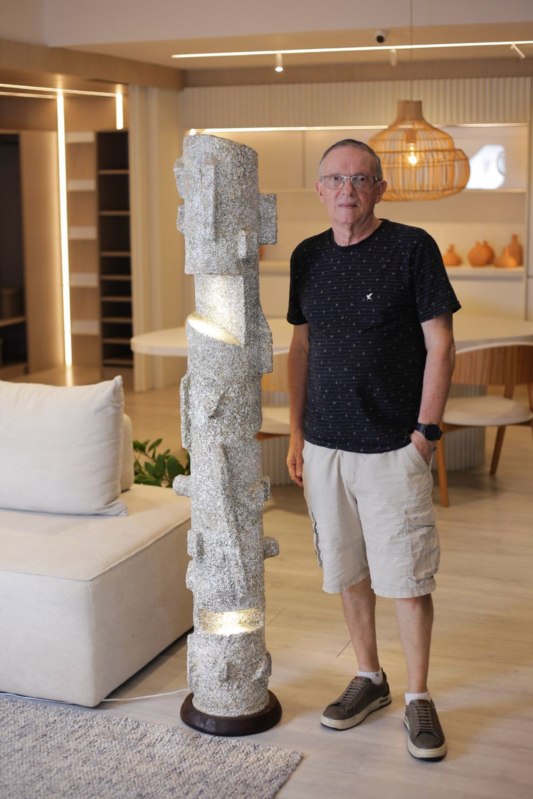 De Pernambuco, o artista argentino radicado em Recife, Sergio Esteban, participa pela primeira vez da Maison&Objet com duas obras autorais que unem design e espiritualidade: a Luminária Totem e a escultura de parede Petrus, ambas criadas a partir de materiais reaproveitados. “Inspiradas nos totens indígenas, as obras evocam proteção, memória e espiritualidade. O totem, com acabamento que lembra pedra e luz interna pulsante, simboliza uma energia vital que conecta céu e terra. A escultura de parede, mais contida e suspensa, funciona como um relicário, carregando camadas de lembrança e força simbólica”, explica o artista.