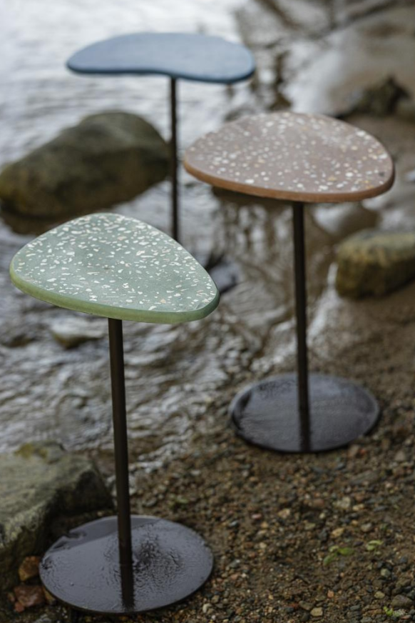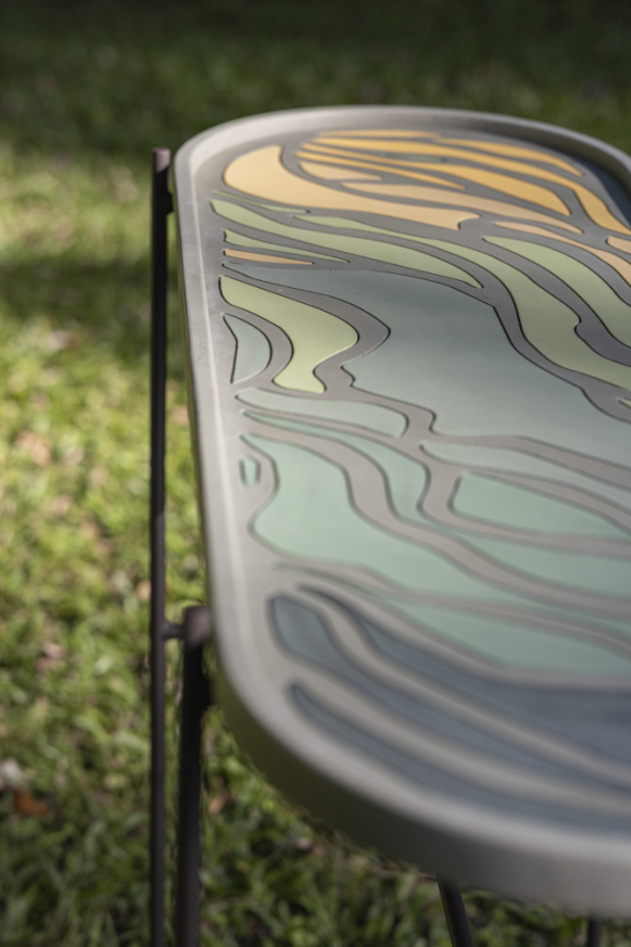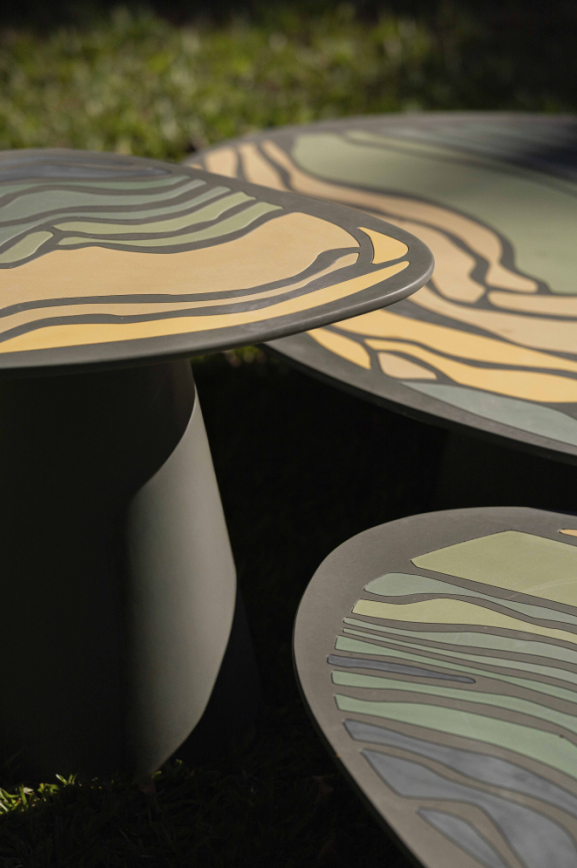 Conceito: como joias em concreto, com formas suaves e cores que evocam o Pantanal, as peças trazem texturas e detalhes que se destacam pela leveza e expressividade. Materiais: tampo em concreto de alto desempenho (Ultra High Performance Concrete - UHPC) e base metálica. Medidas: 24 x 39 x 48 cm / 30 x 36 x 48 cm / 26 x 36 x 48cm.