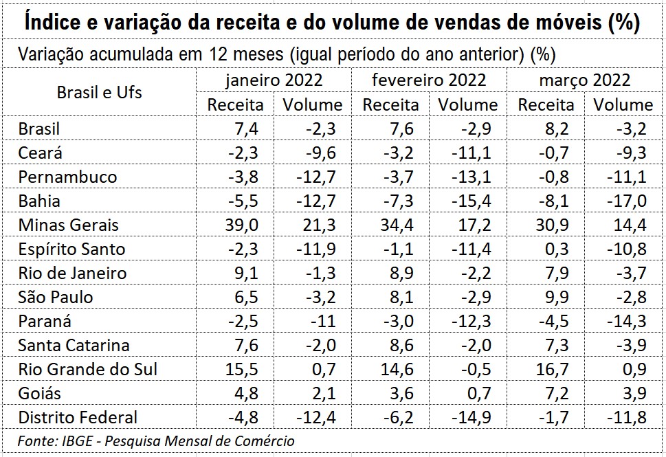 O volume de venda de móveis no varejo vinha apresentando resultados ruins este ano quando comparado a igual período do ano anterior. Em janeiro a queda havia sido de 7,7% e em fevereiro o recuo chegou a 5,5%, segundo a pesquisa mensal do IBGE. Mas em março as vendas reagiram e subiram 10,1% em relação a igual mês de 2021. E melhor ainda quando se avalia a receita nominal de vendas que subiu 26,4% na mesma base de comparação. Isso é resultado dos reajustes de preços na cadeia moveleira.
