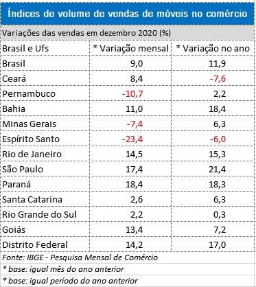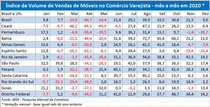 A partir de junho os índices de volume de vendas de móveis registraram números jamais vistos na história da pesquisa do IBGE, como se vê no quadro abaixo. E, em relação a variação acumulada no ano, das 12 regiões pesquisadas, em cinco os índices foram superiores à média nacional, com destaque para São Paulo (21,4%), Bahia (18,4%) e Paraná (18,3%). E apenas dois estados registraram queda no ano, Ceará (-7,6%) e Espírito Santo (-6,0%).