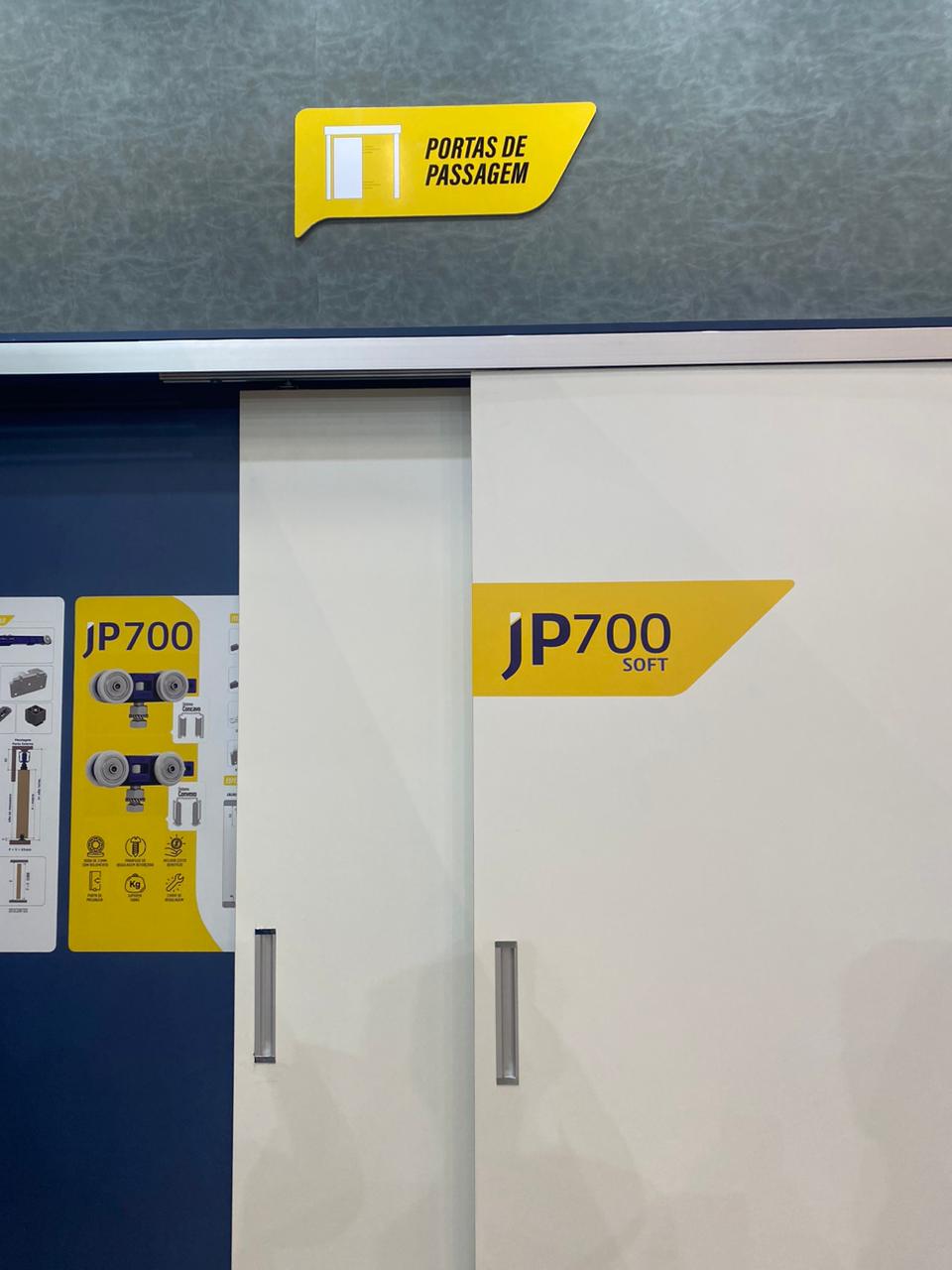 O sistema de passagem de porta JP 700 Soft possui um encaixe simplificado e amortecedor (que pode ser embutido nos dois lados da porta ou em apenas um). Ele suporta portas de até 40kg, sendo elas de madeira ou com espelho e alumínio. Ele também possui parafusos para regulagem de altura e acompanha os trilhos.