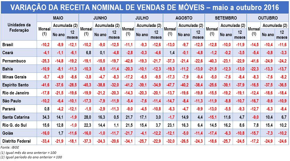 Com os resultados da pesquisa de vendas do varejo em outubro é possível concluir que o ano de 2016 está irremediavelmente perdido também para o setor moveleiro. No acumulado dos dez primeiros meses do ano, o comércio varejista recuou 6,7% em volume de vendas frente a igual período de 2015. Mas o segmento de móveis recuou praticamente o dobro (13,0%) no mesmo período. Em receita nominal de vendas o resultado foi um pouco melhor (-10,4%), porém, em ambos os casos, mesmo que as vendas de novembro e dezembro registrem elevações, é possível concluir que a queda em volume de vendas ficará mesmo em dois dígitos.