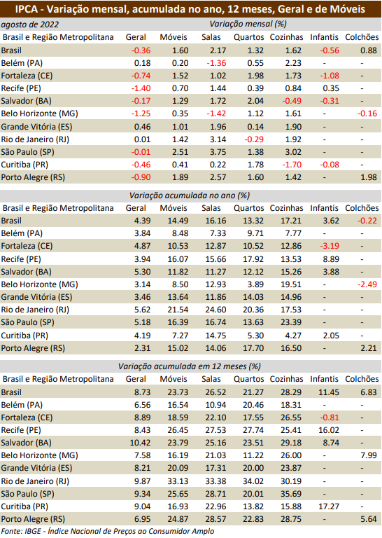 O IPCA de agosto registrou queda de 0,36% enquanto o item mobiliário subiu 1,60%, com pico de 2,17% no segmento de salas. Apenas móveis infantis registraram queda (-0,56%). Proporcionalmente por região, São Paulo, que responde por quase 30% do consumo de móveis no País, registrou as maiores altas, com 2,51% para móveis, 3,75% para o segmento de salas e 1,92% para cozinhas.