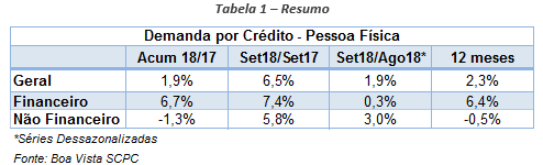 A Demanda por Crédito do Consumidor avançou 1,9% em setembro na comparação mensal dessazonalizada, de acordo com dados nacionais da Boa Vista SCPC. No acumulado em 12 meses, o indicador subiu 2,3% (outubro de 2017 até setembro de 2018 frente aos 12 meses antecedentes). Na avaliação interanual, setembro apresentou alta de 6,5%.