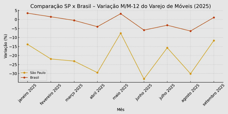 A retração profunda paulista ajuda a explicar por que o varejo de móveis, no agregado nacional, também não consegue ganhar tração em 2025 — mesmo com estímulos pontuais de renda e mercado de trabalho.