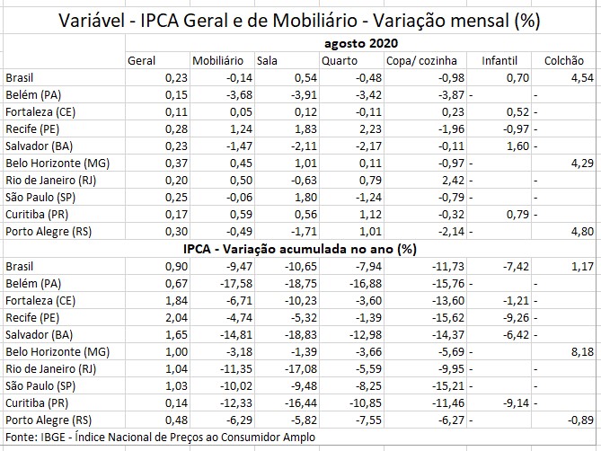 A variação do mobiliário em agosto foi de -0,14%, embora tenha apresentado alta em seis das 9 regiões metropolitanas pesquisadas pelo IBGE. A maior queda aconteceu em Belém (-3,68%) e a maior alta foi verificada em Recife (1,24%).