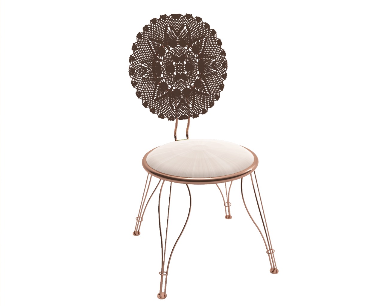 Um bom exemplo acontece na Cadeira Flá ¹, produzida em dois diferentes processos. O processo inédito de eternização, no qual rendas feitas à mão oriundas de diversas regiões brasileiras são eternizadas e enrijecidas em banho de cobre; mas que também apresenta processo totalmente industrializado, no qual rendas autorais, criadas pelo designer a partir da fusão de rendas genuinamente brasileiras, são impressas sob alta tecnologia.