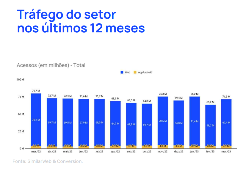 Depois de uma queda de quase 15% em fevereiro, o número de acessos subiu 8% no mês seguinte, alcançando 2,31 bilhões de visitas únicas, segundo o Relatório Setores do E-commerce da Conversion.
