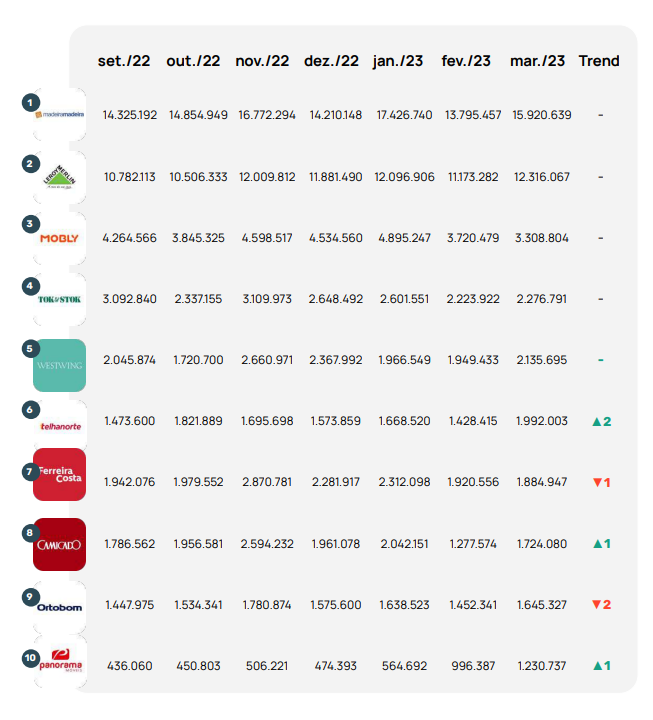 Mais uma vez sem novidade no topo do ranking da categoria, já que MadeiraMadeira, Leroy Merlin e Mobly continuam nas três primeiras posições, respectivamente. E, apesar da crise, a Tok&Stok segue na 4ª colocação.