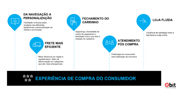 Houve um grande avanço por parte dos lojistas, mas ainda tem uma ótima oportunidade de melhora da experiência do consumidor (imagem abaixo). 2021 será o ano de pensar na experiência de compra, frete mais eficiente, fechamento do carrinho (segurança e facilidade), atendimento pós-compra e coerência entre loja física e online.
