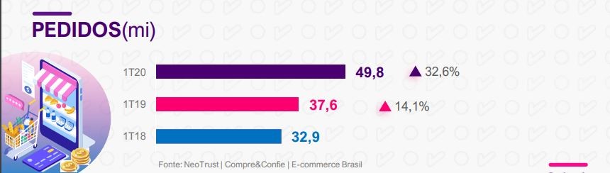 De acordo com o relatório, o e-commerce mantém a trajetória de alta observada desde 2018, alcançando quase 50 milhões de compras online no 1º trimestre de 2020, que superam os R$ 20 bilhões.