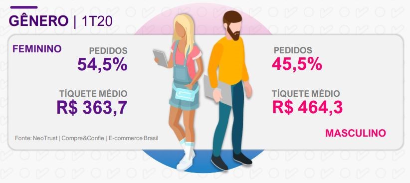 O relatório também revela que, na divisão por gênero, as mulheres continuam sendo as principais responsáveis pelo alto volume de compras via e-commerce, enquanto os homens fazem compras de maior valor financeiro.