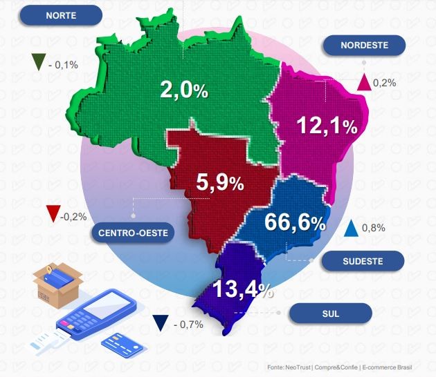 - A região Sudeste concentra a maior parte das vendas online no país, sendo responsável por mais de 65% dos pedidos realizados;