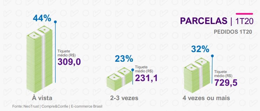 - Mesmo antes da crise atual, brasileiros já buscavam reduzir seu endividamento com as compras online. Ao todo, 67% das compras feitas no trimestre foram pagas à vista ou parceladas em, no máximo, três vezes.