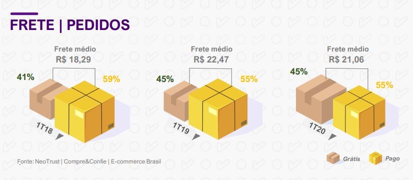 A proporção de frete pago ante gratuito no país se mantém estável desde o ano passado. A redução no valor, observada este ano, pode estar ligada às promoções realizadas nos primeiros meses de 2020 e ao consequente volume de compras realizadas nesse período, especialmente em janeiro.