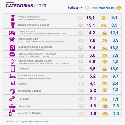 O comportamento do consumo durante o 1º trimestre ainda segue, em grande medida, o observado em períodos anteriores: o segmento de Moda e Acessórios permanece como destaque absoluto em número de pedidos e, em faturamento, o primeiro lugar é ocupado por Telefonia.