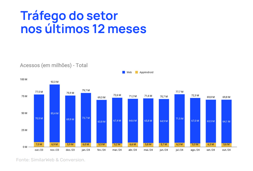 Inclusive, se analisarmos o desempenho dos apps dessa categoria no mês de outubro, vamos observar uma queda de 9,9% dos acessos em relação ao mês anterior. Mesmo que em Casa & Móveis os acessos via apps representem apenas 8,1% do tráfego mensal, essa queda contribuiu para a baixa do desempenho nesse setor no 10º mês do ano.